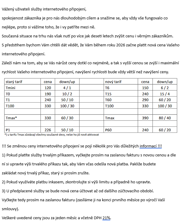 Vážený uživateli služby internetového připojení.